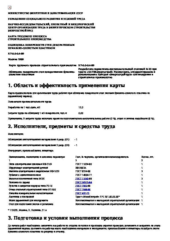 КТ 0.0-0.4-89: Карта трудового процесса строительного производства. Облицовка поверхности стен декоративным бумажно-слоистым пластиком
