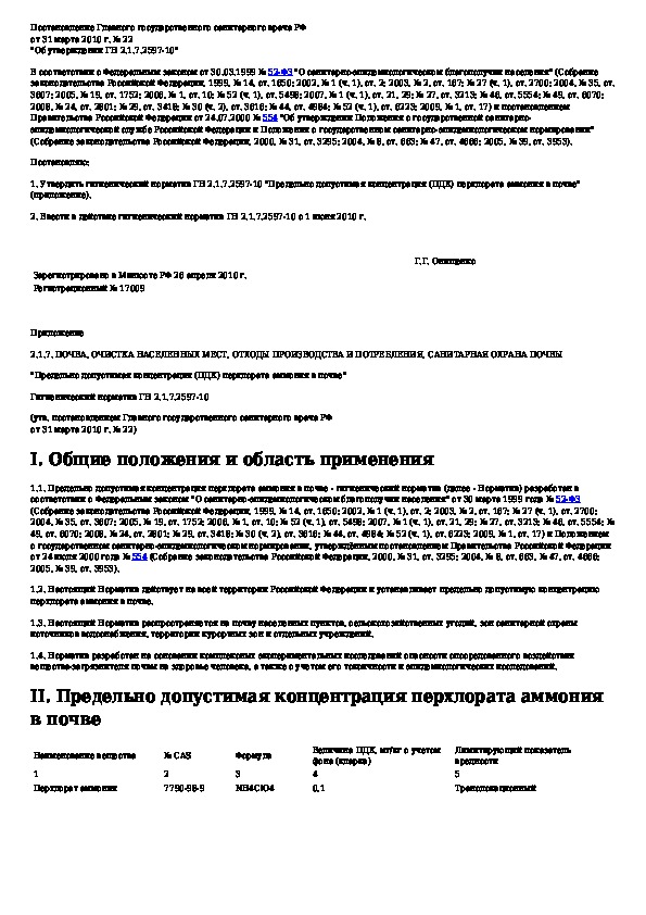 ГН 2.1.7.2597-10: Предельно допустимая концентрация (ПДК) перхлората аммония в почве