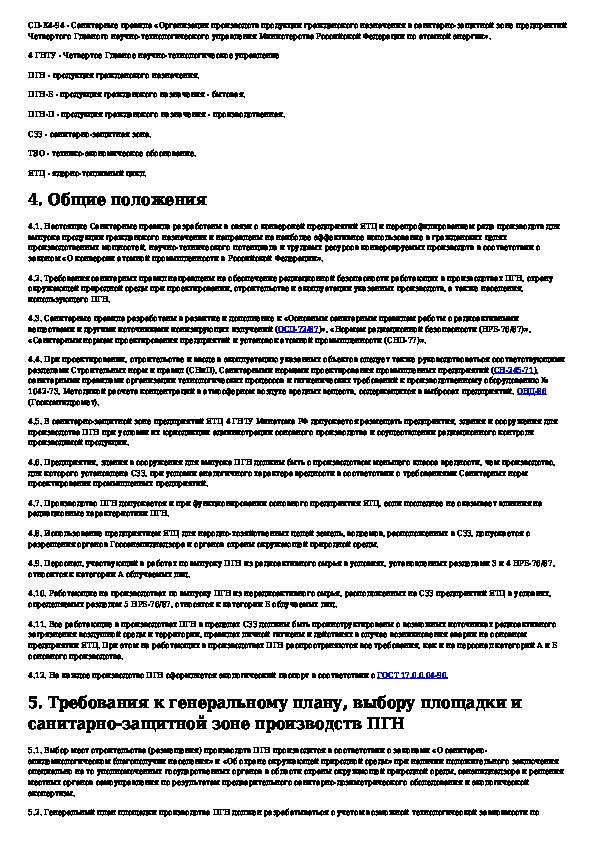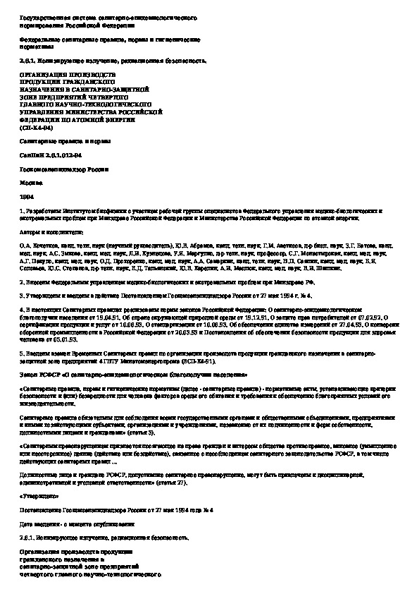 СанПиН 2.6.1.012-94: Организация производств продукции гражданского назначения в санитарно-защитной зоне предприятий четвертого главного научно-тех