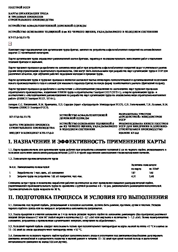 КТ 17.0-10.11-75: Устройство асфальтобетонной дорожной одежды. Устройство основания толщиной 6 см из черного щебня укладываемого в холодном состоя