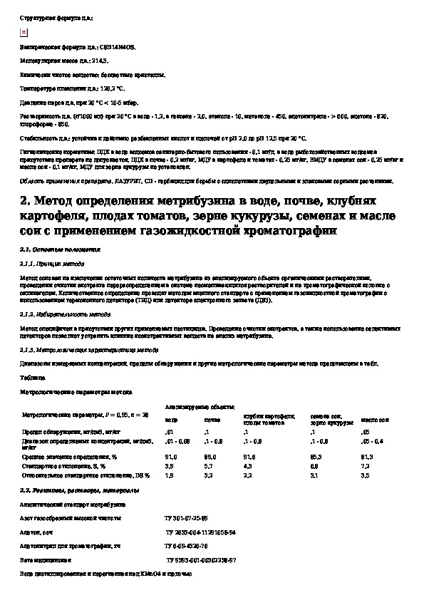 Определение остаточных количеств метрибузина в воде, почве, клубнях картофеля, плодах томатов, зерне кукурузы, семенах и масле сои