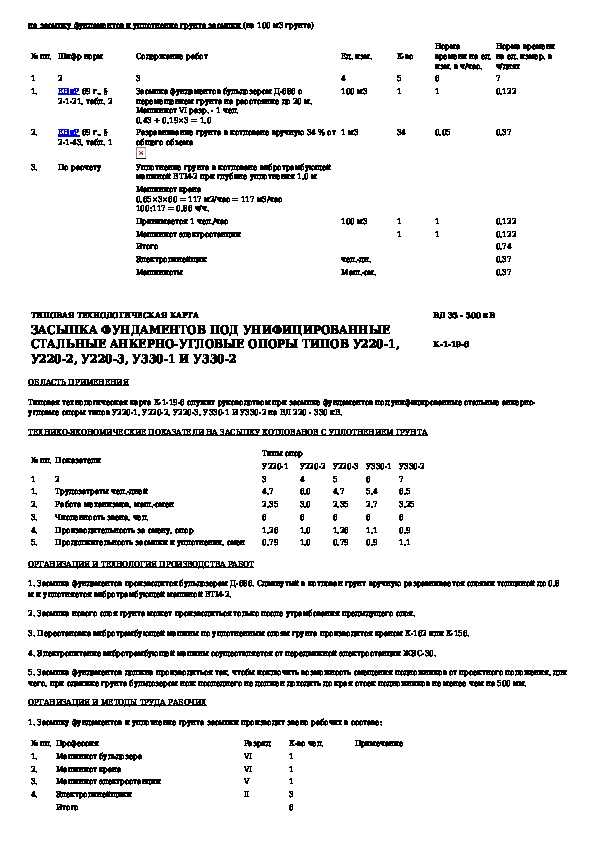 Типовая технологическая карта. Засыпка фундаментов под унифицированные стальные анкерно-угловые опоры типов У220-1, У220-2, У220-3, У330-1 и