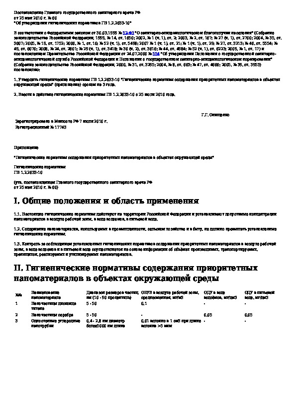 Гигиенические нормативы содержания приоритетных наноматериалов в объектах окружающей среды