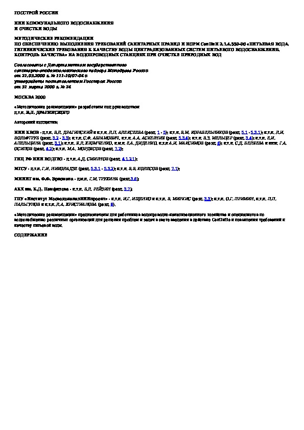 МДС 40-3.2000: Методические рекомендации по обеспечению выполнения требований санитарных правил и норм СанПиН 2.1.4.559-96 "Питьевая вода. Гигиеничес