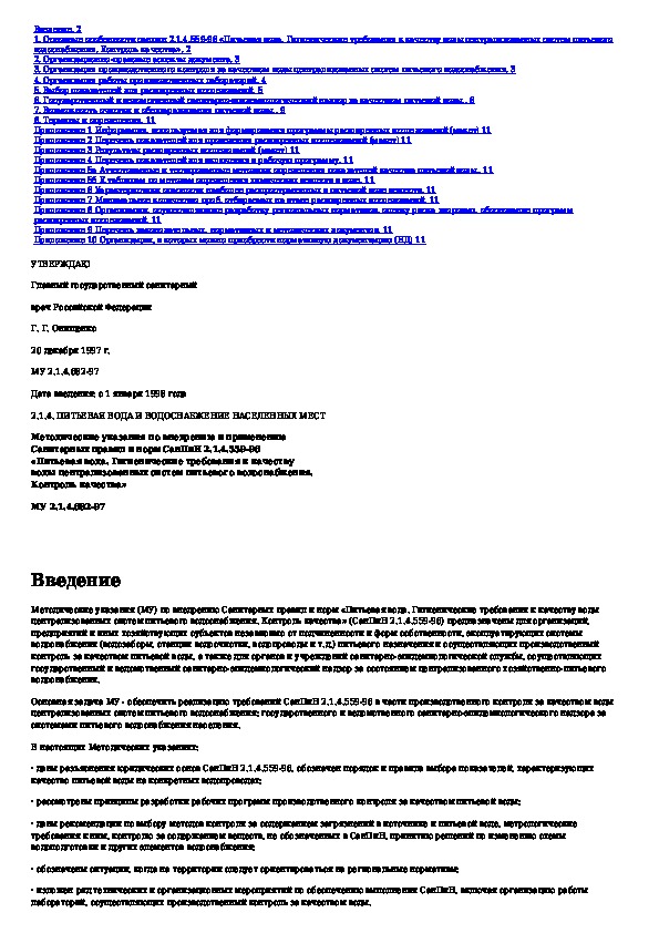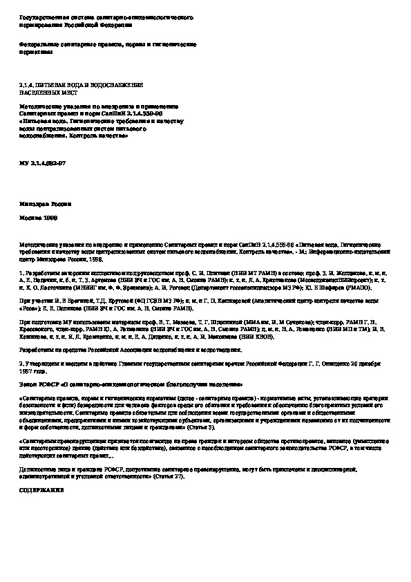 Наша цель состоит в том, чтобы предоставить вам быстрый доступ к содержанию документа Методические указания по внедрению и применению Санитарных правил и норм СанПиН 2.1.4.559-96 "Питьевая вода. Гигиенические требования к.