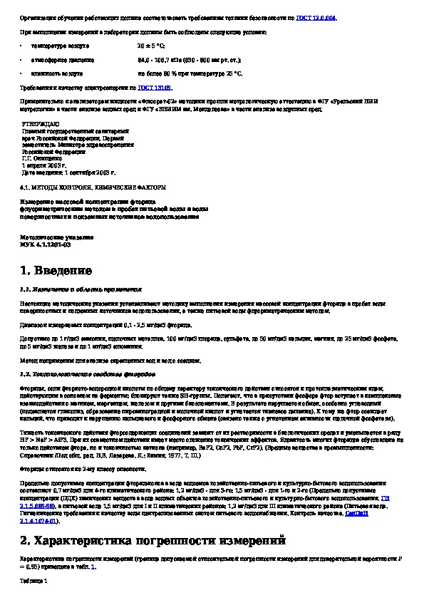 МУК 4.1.1261-03: Измерение массовой концентрации фторида флуориметрическим методом в пробах питьевой воды и воды поверхностных и подземных источ