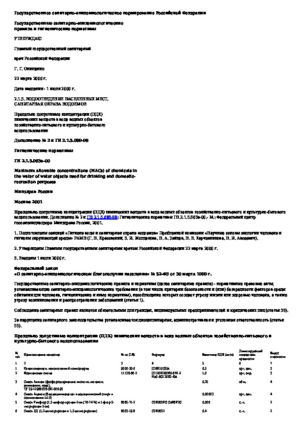 Предельно допустимые концентрации (ПДК) химических веществ в воде водных объектов хозяйственно-питьевого и культурно-бытового во