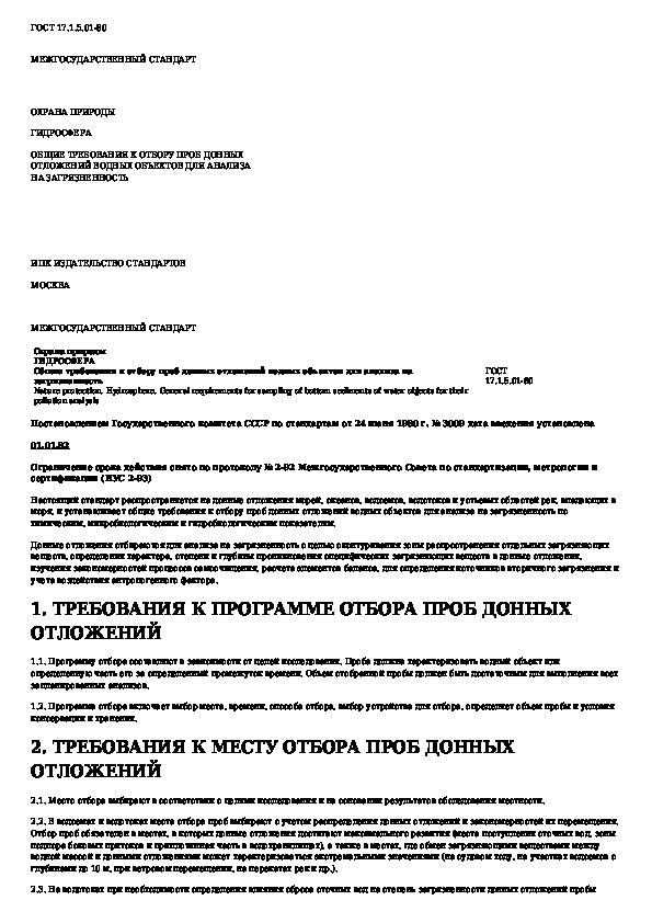 ГОСТ 17.1.5.01-80: Охрана природы. Гидросфера. Общие требования к отбору проб донных отложений водных объектов для анализа на загрязненность
