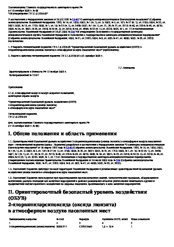 ГН 2.1.6.2556-09: Ориентировочный безопасный уровень воздействия (ОБУВ) 2-хлорвиниларсиноксида (оксида люизита) в атмосферном воздухе населенных ме