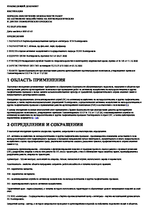 РД 52.37.615-2000: Порядок обеспечения безопасности работ по активному воздействию на метеорологические и другие геофизические процессы