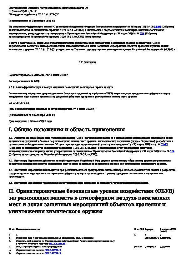 ГН 2.1.6.1372-03: Гигиенические нормативы ориентировочных безопасных уровней воздействия (ОБУВ) загрязняющих веществ в атмосферном воздухе населе