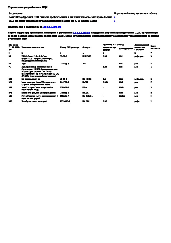 Предельно допустимые концентрации (ПДК) загрязняющих веществ в атмосферном воздухе населенных мест. Дополнение N 3 к ГН 2.1.6.695-98
