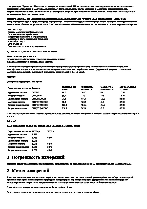 МУК 4.1.616-96: Методические указания по газохроматографическому определению одноосновных карбоновых кислот в атмосферном воздухе