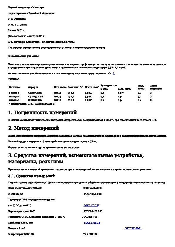 МУК 4.1.1046-01: Газохроматографическое определение орто-, мета- и параксилолов в воздухе