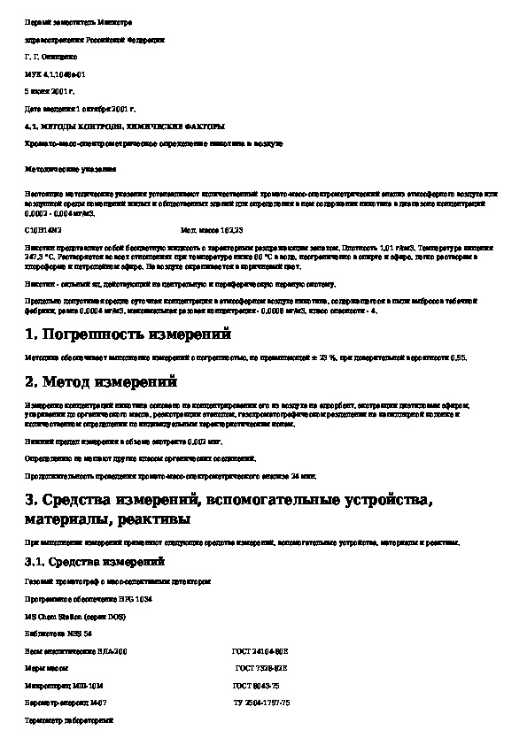 МУК 4.1.1048а-01: Хромато-масс-спектрометрическое определение никотина в воздухе