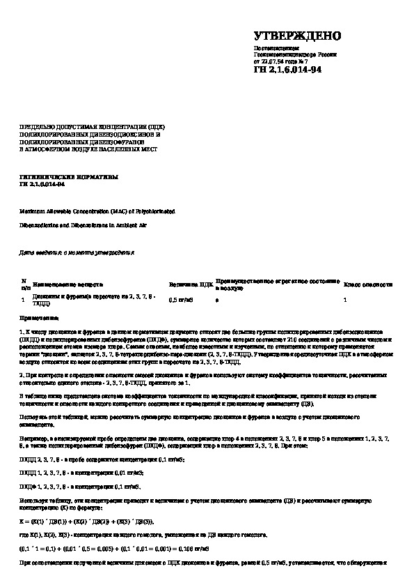 Предельно допустимая концентрация (ПДК) полихлорированных дибензодиоксинов и полихлорированных дибензофуранов в атмосферном во