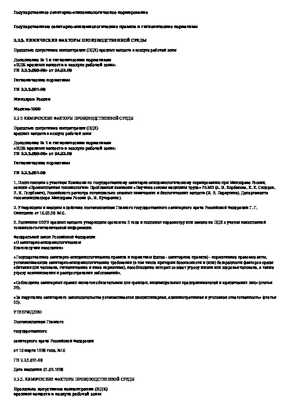 ГН 2.2.5.691-98: Предельно допустимые концентрации (ПДК) вредных веществ в воздухе рабочей зоны. Дополнение N 1 к гигиеническим нормативам "ПДК вред