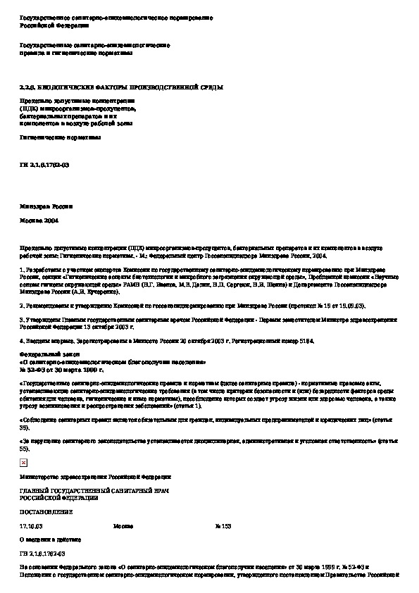 ГН 2.2.6.1762-03: Предельно допустимые концентрации (ПДК) микроорганизмов-продуцентов, бактериальных препаратов и их компонентов в воздухе рабочей