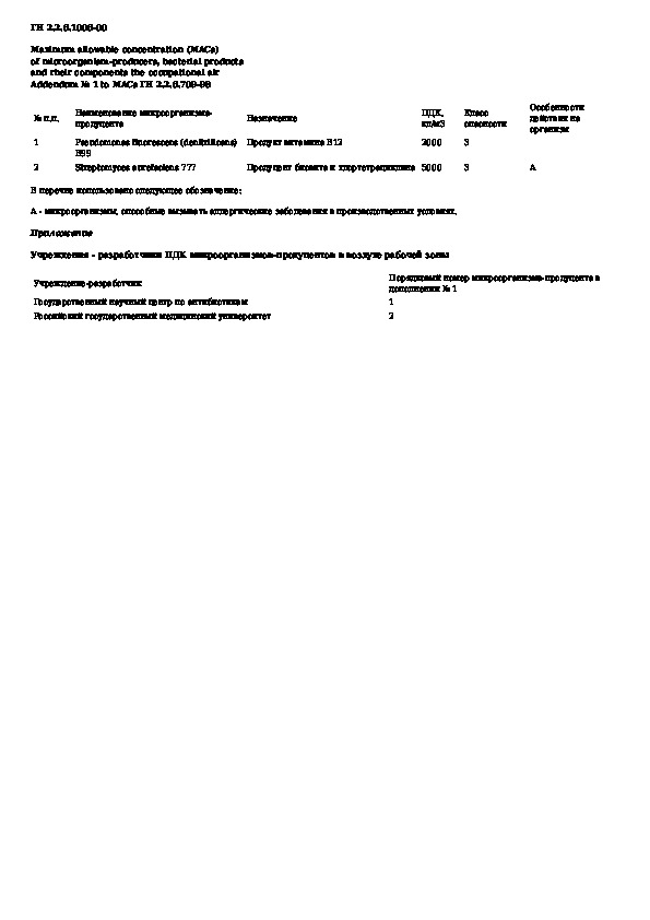 Предельно допустимые концентрации (ПДК) микроорганизмов-продуцентов, бактериальных препаратов и их компонентов в воздухе рабочей
