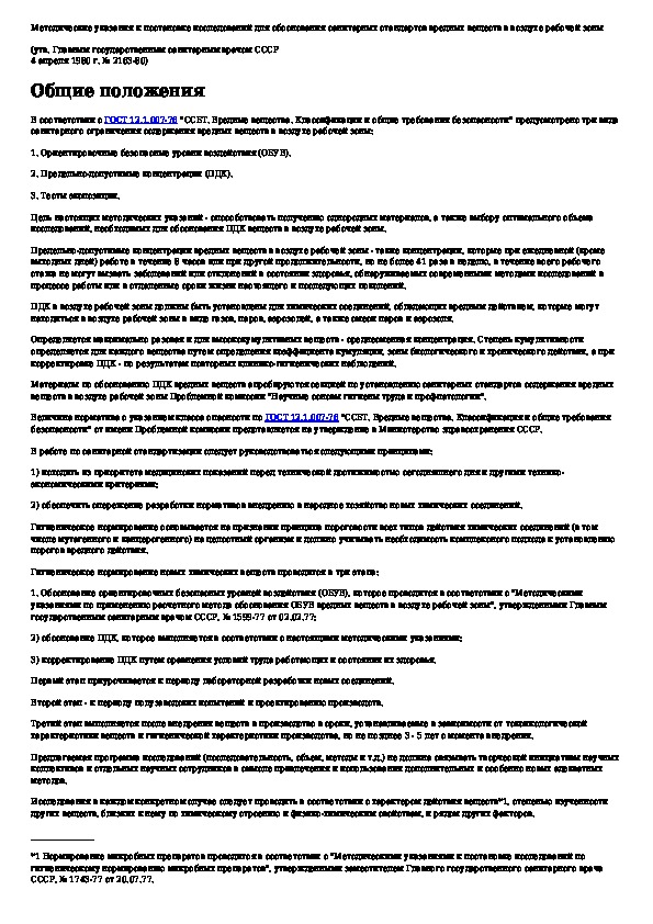 МУ 2163-80: Методические указания к постановке исследований для обоснования санитарных стандартов вредных веществ в воздухе рабочей зоны