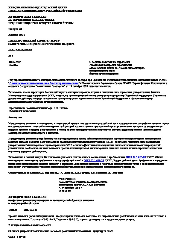 Наша цель состоит в том, чтобы предоставить вам быстрый доступ к содержанию документа Методические указания по фотометрическому измерению концентраций бромида аммония в воздухе рабочей зоны.