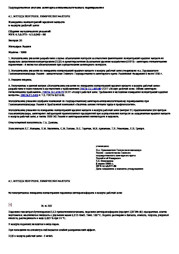 МУК 4.1.0.317-96: Фотометрическое измерение концентрации пероксида дигидроизофорона в воздухе рабочей зоны