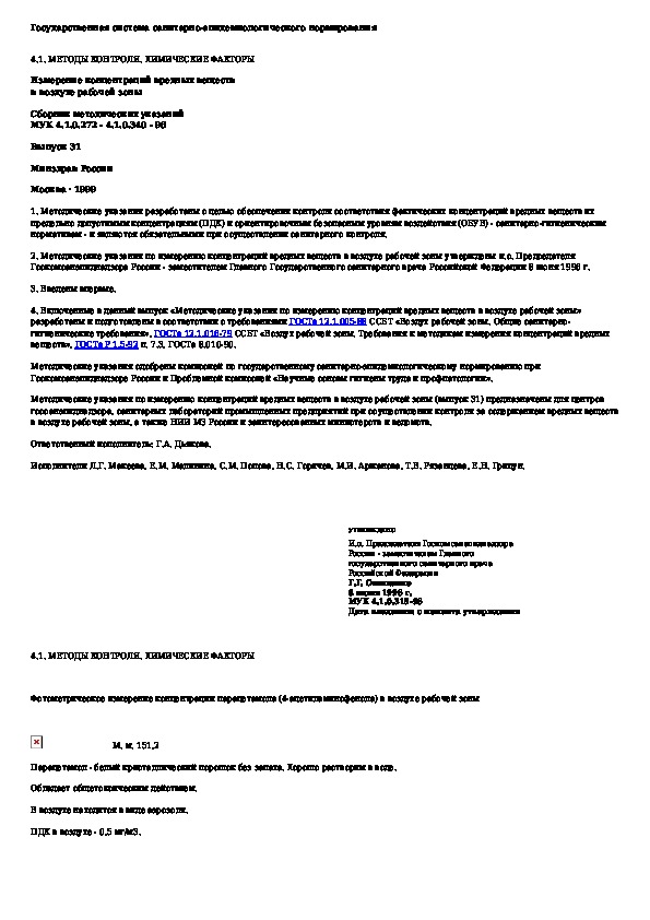 МУК 4.1.0.315-96: Фотометрическое измерение концентрации парацетамола (4-ацетиламинофенола) в воздухе рабочей зоны