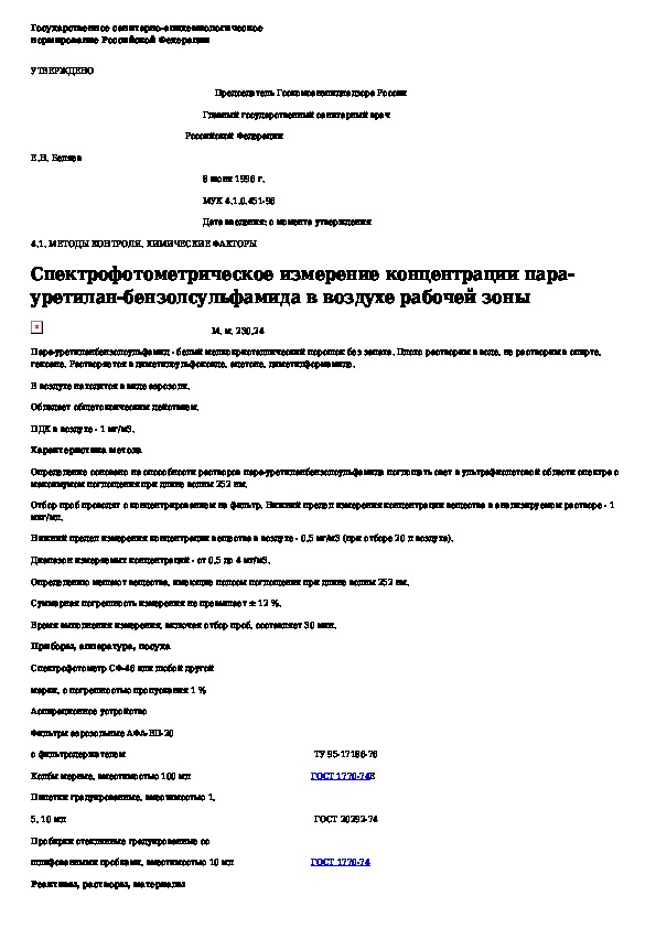 МУК 4.1.0.451-96: Спектрофотометрическое измерение концентрации пара-уретилан-бензолсульфамида в воздухе рабочей зоны