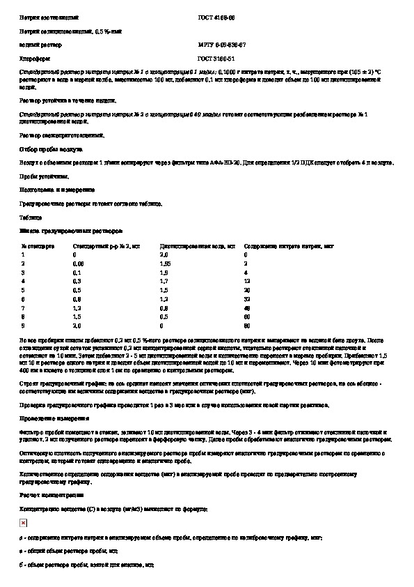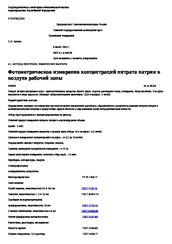 МУК 4.1.0.446-96: Фотометрическое измерение концентраций нитрата натрия в воздухе рабочей зоны