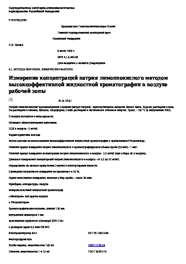 МУК 4.1.0.445-96: Измерение концентраций натрия лимоннокислого методом высокоэффективной жидкостной хроматографии в воздухе рабочей зоны