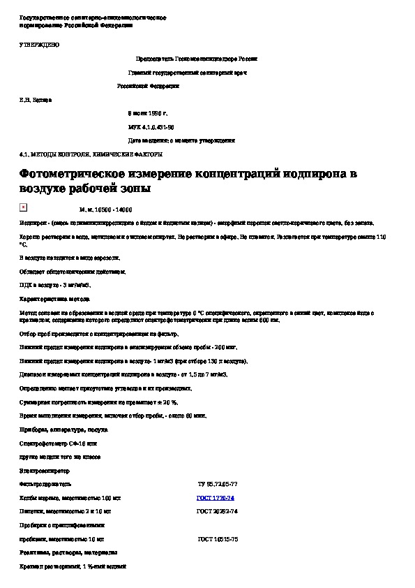 МУК 4.1.0.431-96: Фотометрическое измерение концентраций иодпирона в воздухе рабочей зоны