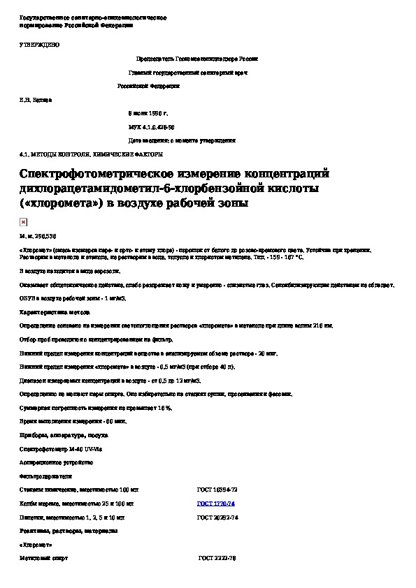 МУК 4.1.0.428-96: Спектрофотометрическое измерение концентраций дихлорацетамидометил-6-хлорбензойной кислоты ("хлоромета") в воздухе рабочей зоны