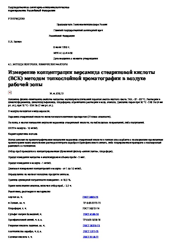 МУК 4.1.0.414-96: Измерение концентрации версамида стеариновой кислоты (ВСК) методом тонкослойной хроматографии в воздухе рабочей зоны
