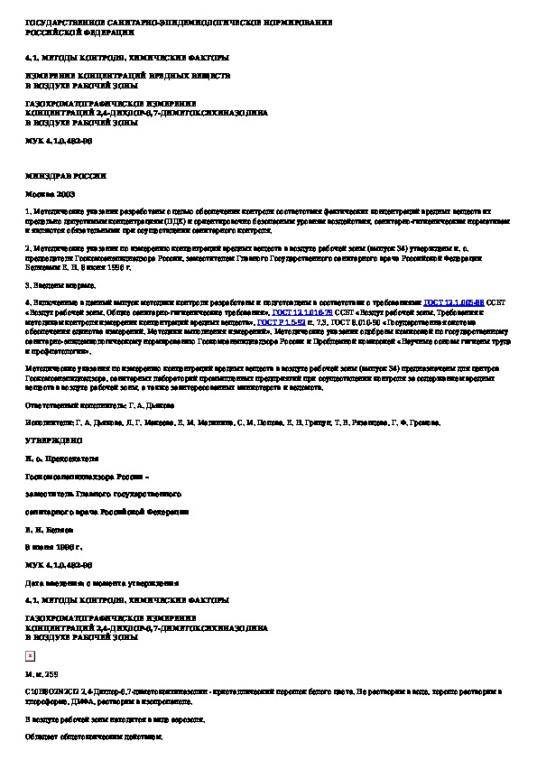МУК 4.1.0.482-96: Газохроматографическое измерение концентраций 2,4-дихлор-67-диметоксихиназолина в воздухе рабочей зоны