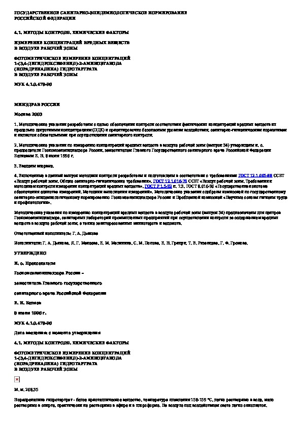 МУК 4.1.0.478-96: Фотометрическое измерение концентраций 1-(3,4-дигидроксифенил)-2-аминоэтанола (норадреналина) гидротартрата в воздухе рабочей зоны