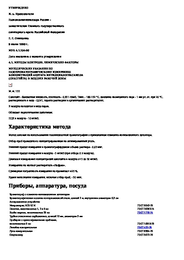 • Просмотр в полноэкранном режиме - легко просмотреть документ Методические указания по газохроматографическому измерению концентраций ацетата метилциклогексанола (секстейта) в воздухе рабо (без загрузки его на свой компьютер).