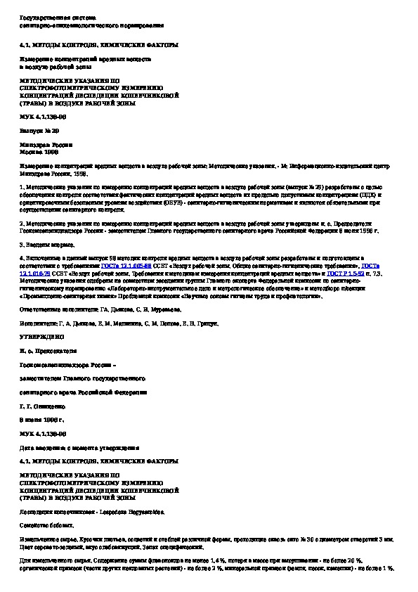 МУК 4.1.138-96: Методические указания по спектрофотометрическому измерению концентраций леспедеции копеечниковой (травы) в воздухе рабочей зоны