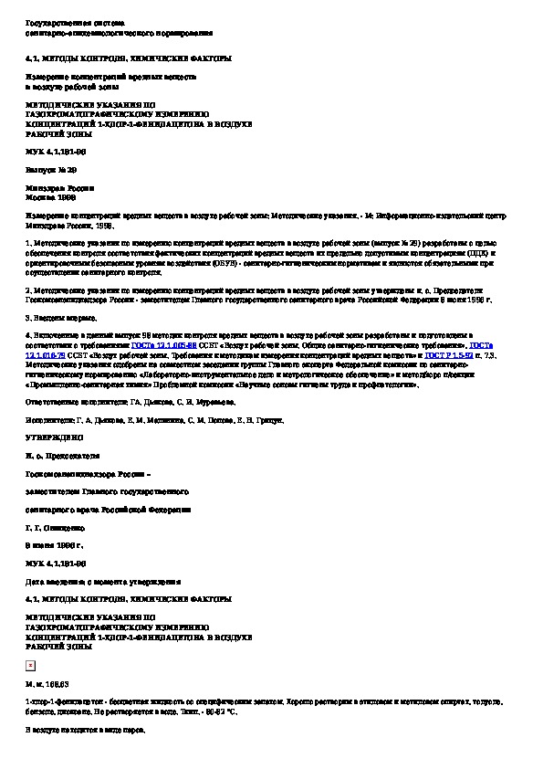 МУК 4.1.181-96: Методические указания по газохроматическому измерению концентраций 1-хлор-1-фенилацетона в воздухе рабочей зоны