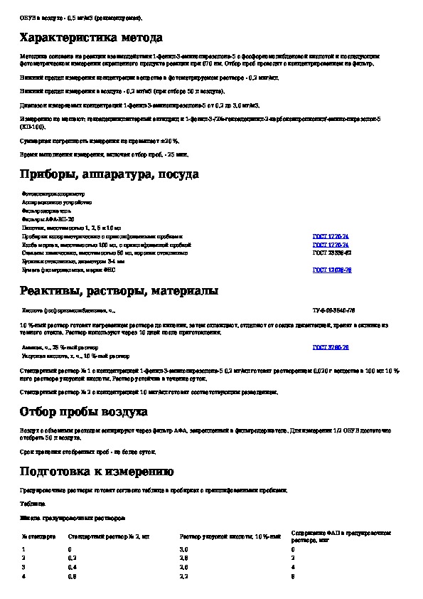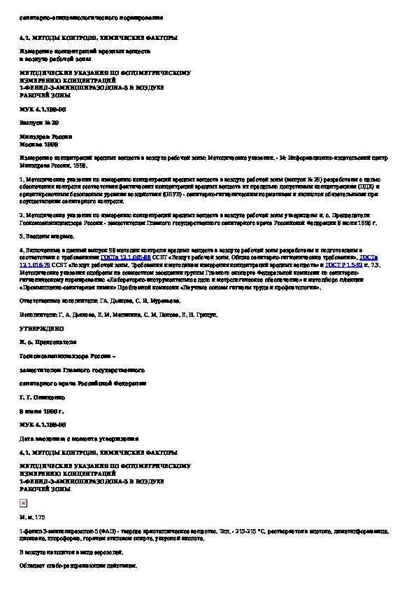 МУК 4.1.188-96: Методические указания по фотометрическому измерению концентраций 1-фенил-3-аминопиразолона-5 в воздухе рабочей зоны