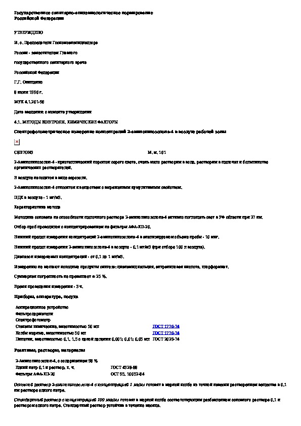 МУК 4.1.201-96: Спектрофотометрическое измерение концентраций 2-аминохинозолона-4 в воздухе рабочей зоны
