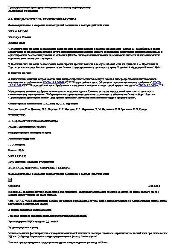 МУК 4.1.216-96: Фотометрическое измерение концентраций госсипола в воздухе рабочей зоны