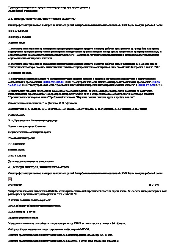 • Просмотр в полноэкранном режиме - легко просмотреть документ Спектрофотометрическое измерение концентраций 2-карбометоксиаминохинозолона-4 (КМАХа) в воздухе рабочей зоны (без загрузки его на свой компьютер).