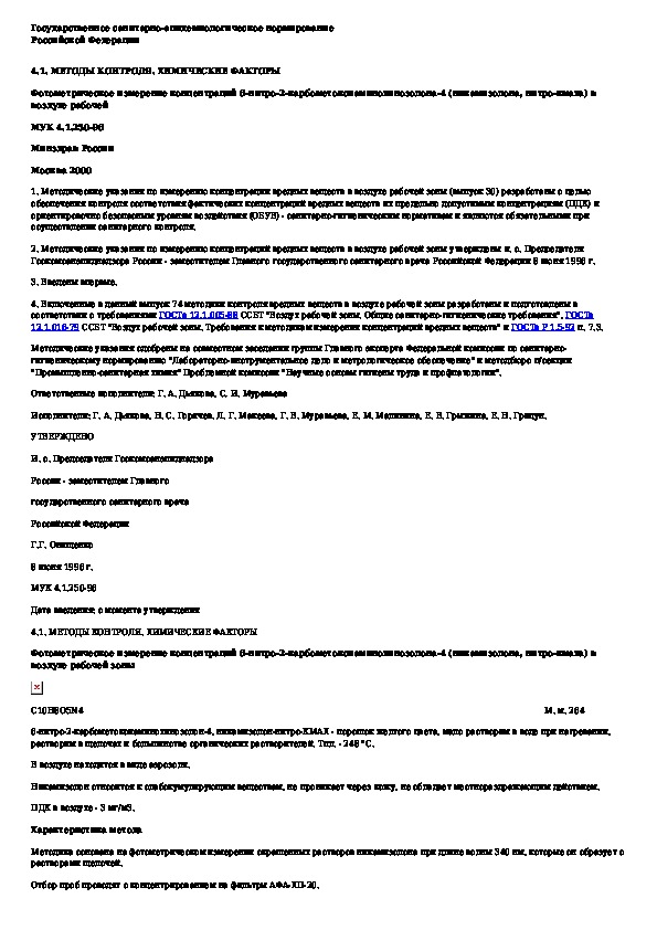 МУК 4.1.250-96: Фотометрическое измерение концентраций 6-нитро-2-карбометоксиаминохинозолона-4 (никамизолона, нитро-кмаха) в воздухе рабочей зоны
