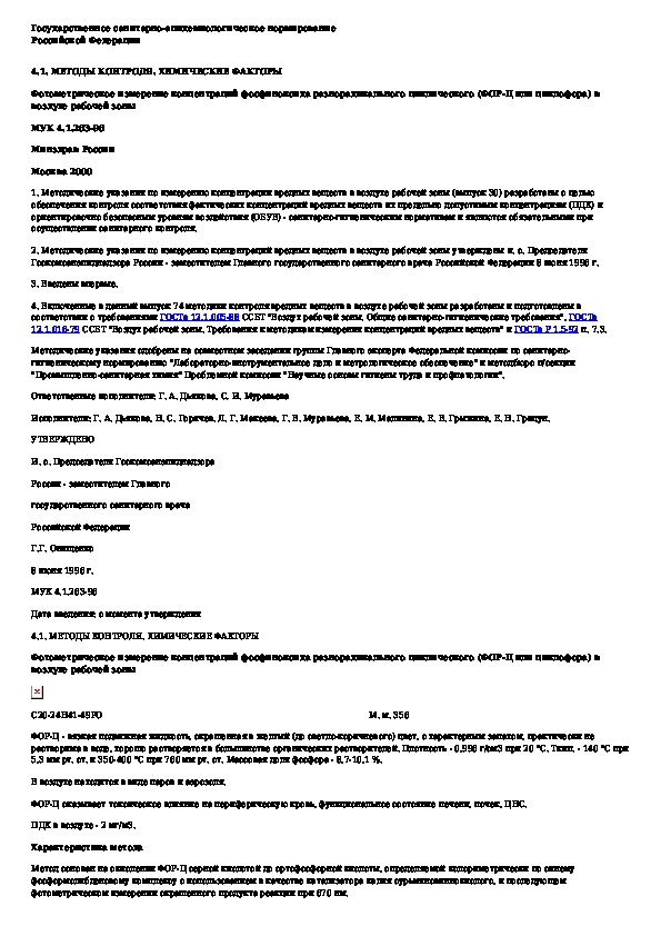 МУК 4.1.263-96: Фотометрическое измерение концентраций циклического (ФОР-Ц или циклофора) в воздухе рабочей зоны