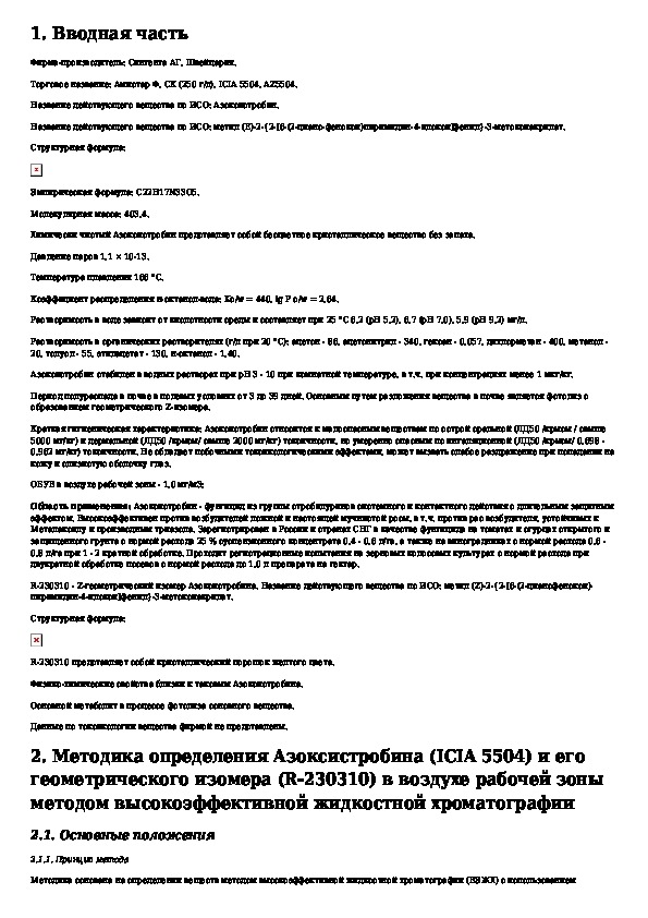 Измерение остаточных количеств Азоксистробина (ICIA 5504) и его геометрического изомера (R-230310) в воздухе рабочей зоны методом высокоэф