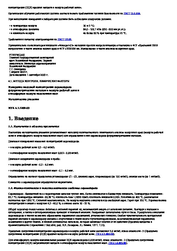МУК 4.1.1269-03: Измерение массовой концентрации сероводорода флуориметрическим методом в воздухе рабочей зоны и атмосферном воздухе населенных
