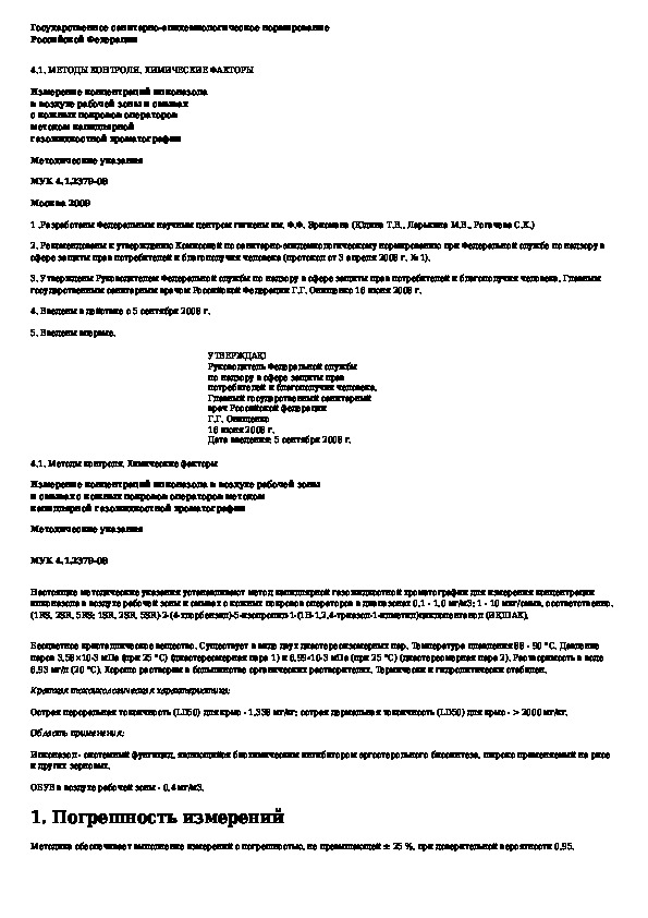 Измерение концентраций ипконазола в воздухе рабочей зоны и смывах с кожных покровов операторов методом капиллярной газожидкостн