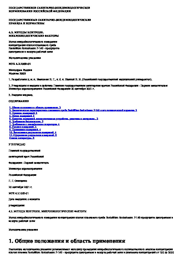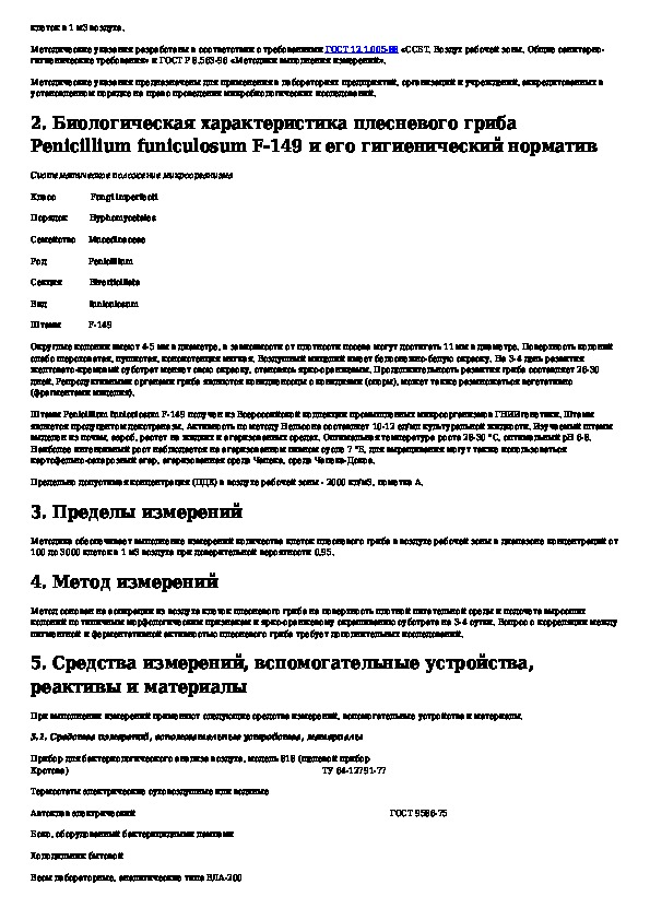 МУК 4.2.1069-01: Метод микробиологического измерения концентрации клеток плесневого гриба Penicillium funiculosum F-149 - продуцента декстраназы в воздухе раб
