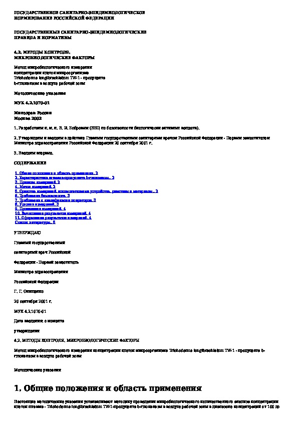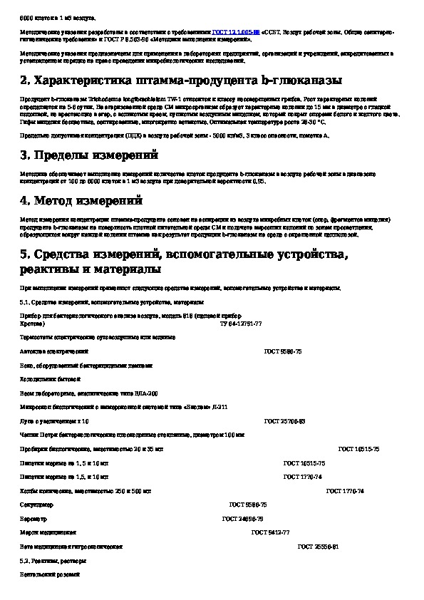 МУК 4.2.1070-01: Метод микробиологического измерения концентрации клеток микроорганизма Trichoderma longibrachiatum TW-1 - продуцента В-глюканазы в воздухе рабо
