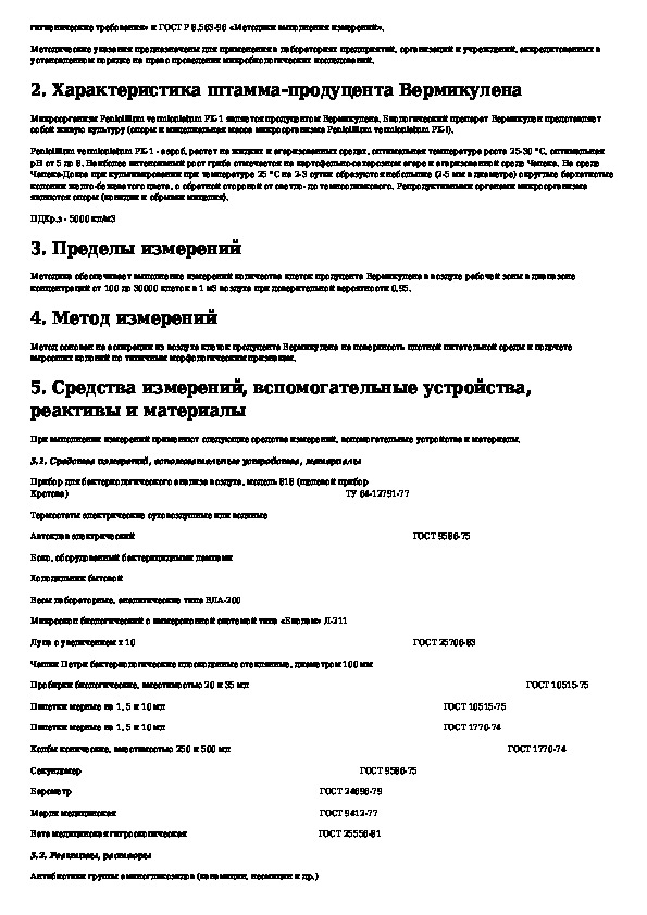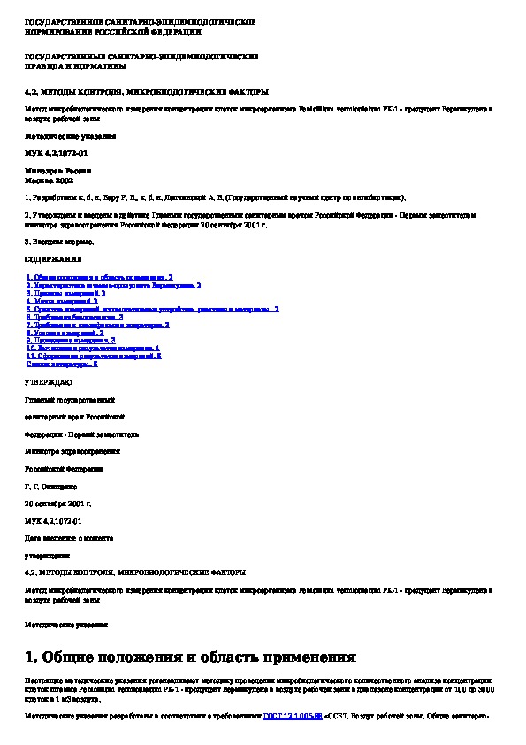 МУК 4.2.1072-01: Метод микробиологического измерения концентрации клеток микроорганизма Penicillium vermiculatum PK-1 - продуцент Вермикулена в воздухе рабоче